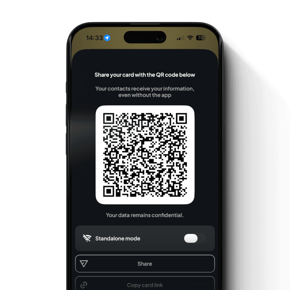 Die Visitenkarte von azzapp hat einen einzigartigen QR-Code, der deine Kontaktinformationen enthält. Kompatibel mit allen Smartphones – teile sie ganz einfach mit einem Tippen oder Schütteln deines Handys, um deinen persönlichen, komplett sicheren QR-Code anzuzeigen. Der Empfänger braucht keine App, um deine Kontaktdaten zu erhalten!